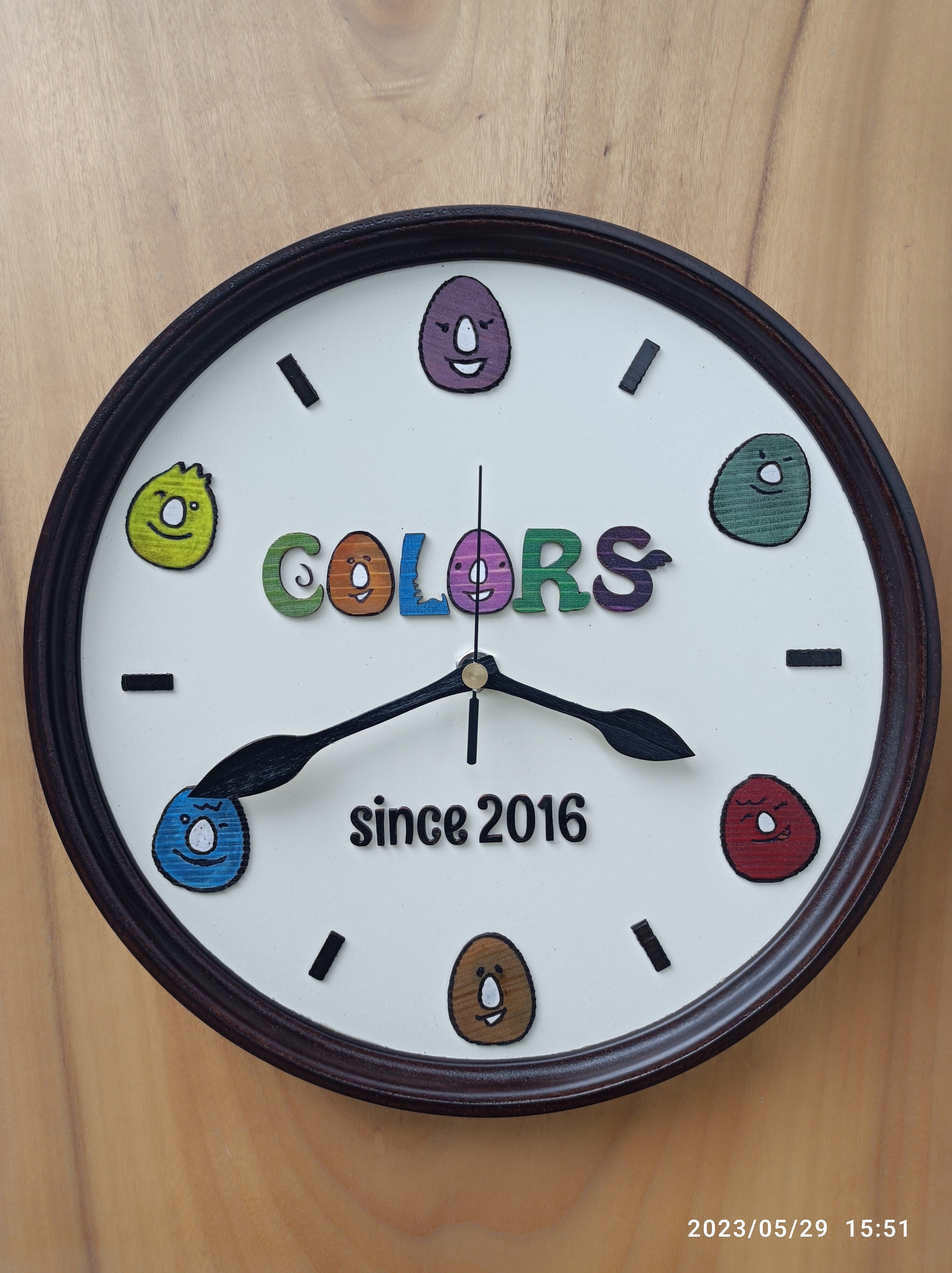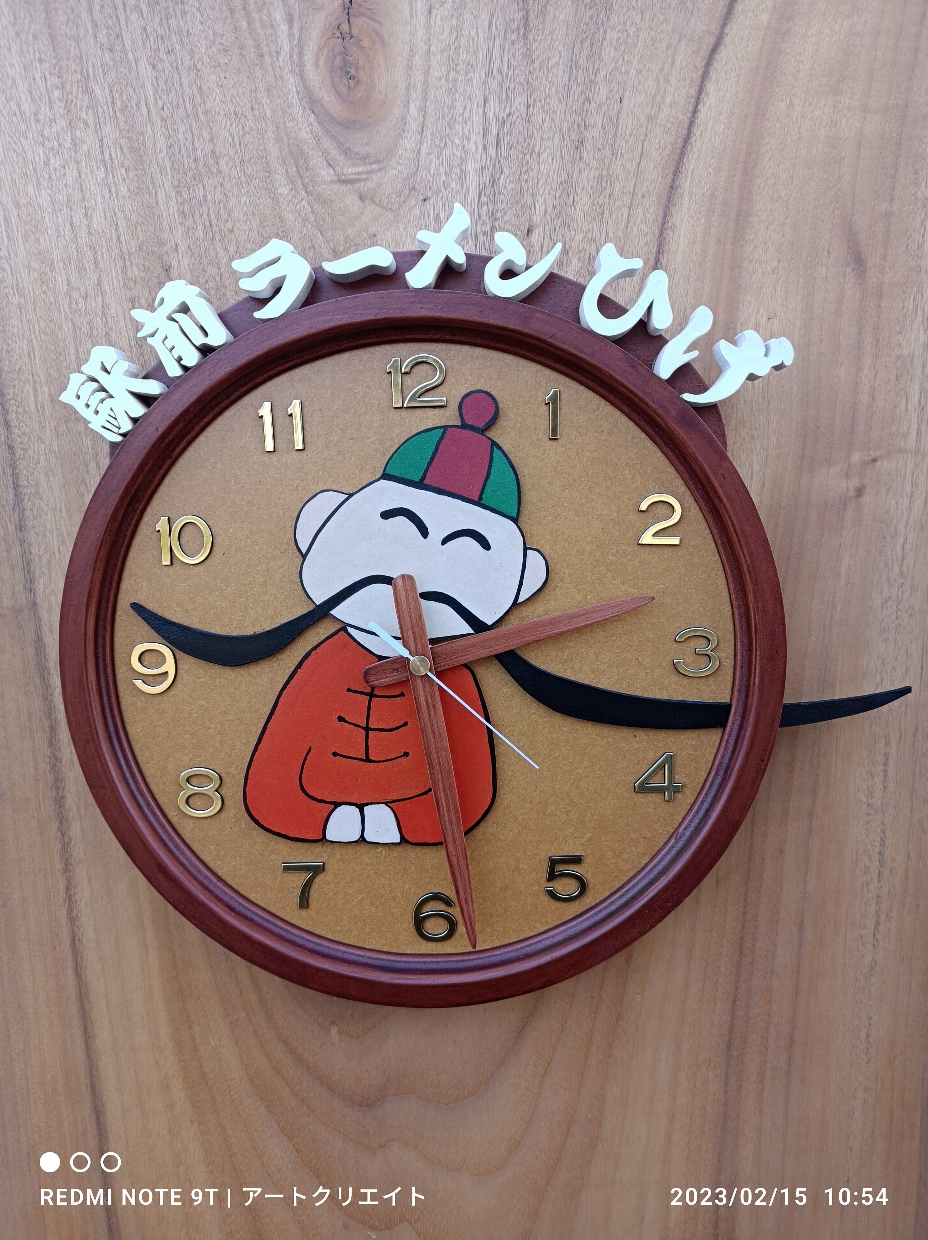 文字盤のうえにはお店のロゴ(木製)をカットして貼り付けていますが