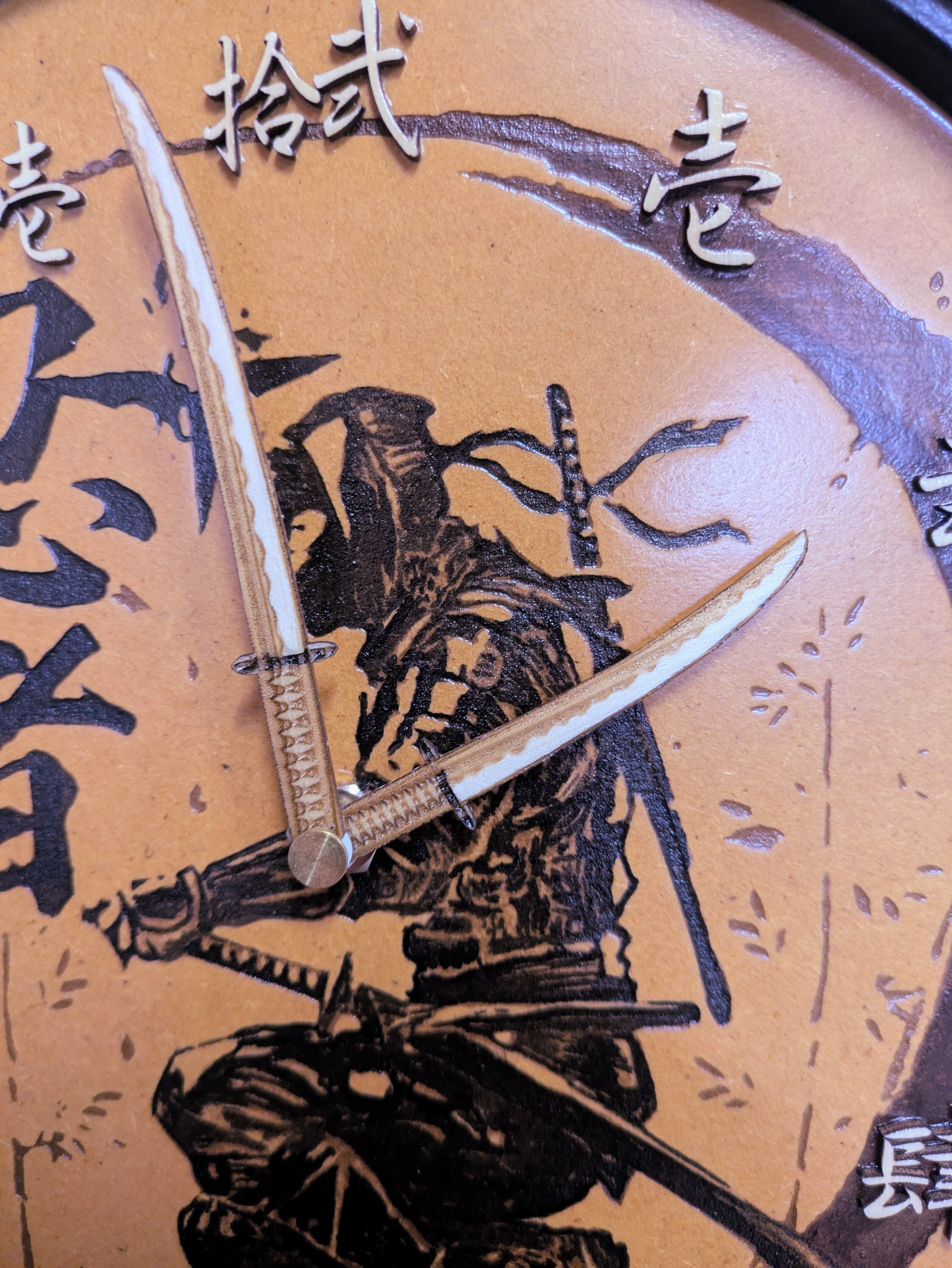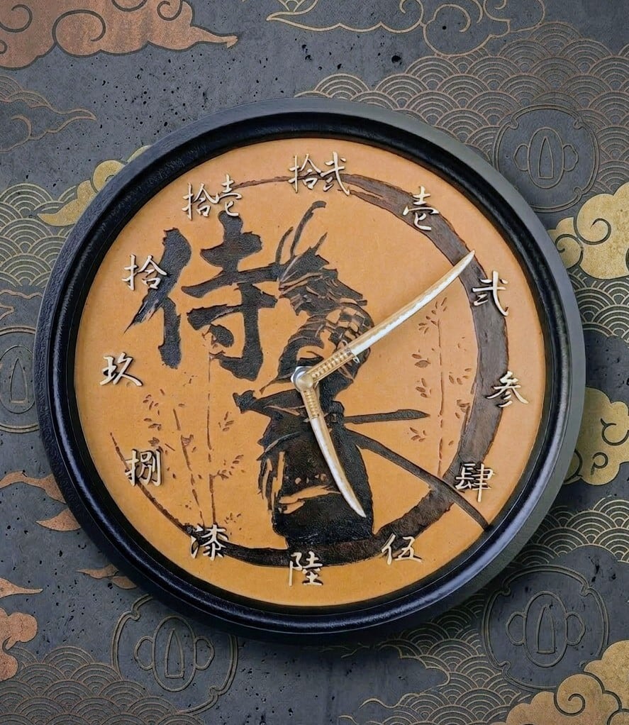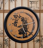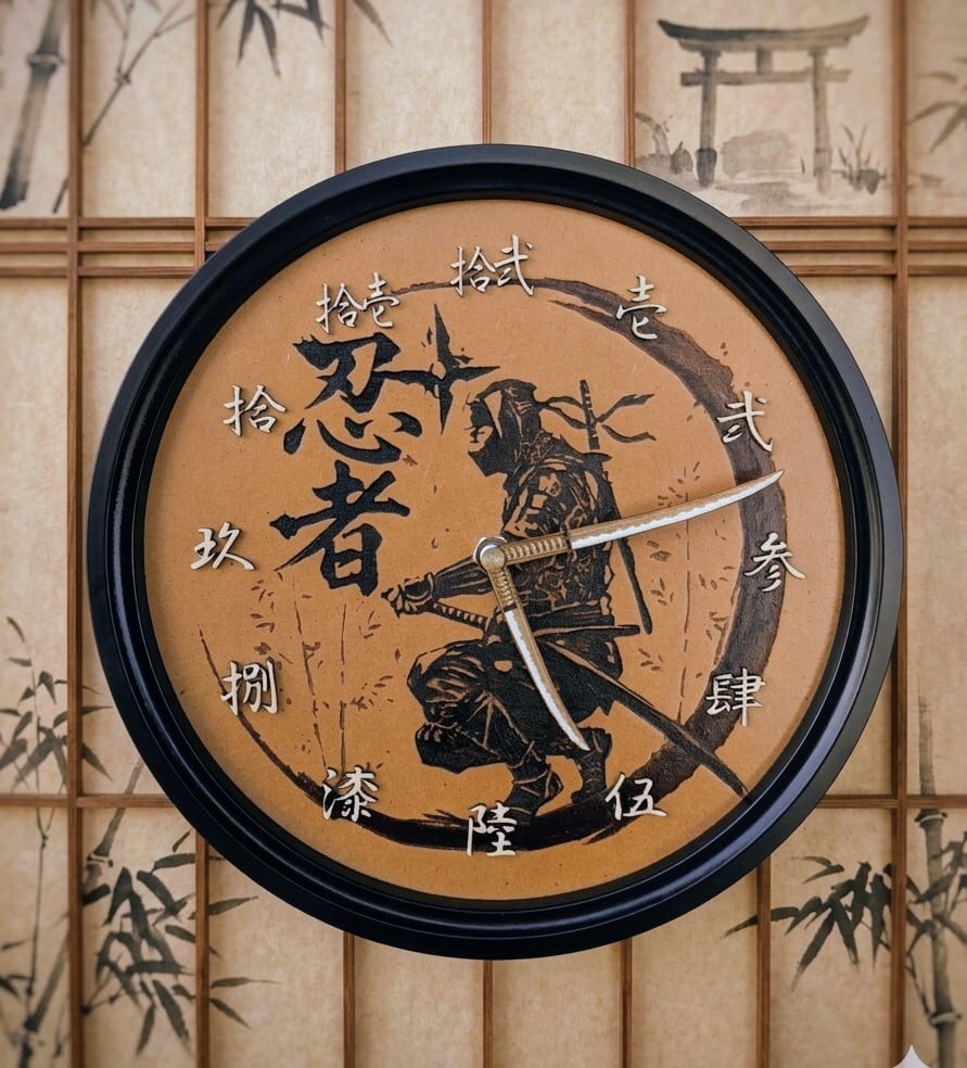 日本の伝統的な美学と、現代的なグラフィックデザインが絶妙にミックスした作品 忍者・侍や武道が好きな方はもちろん、デスク周りやリビングに**「静寂と強さ」**のアクセントを加えたい場合には最高のアイテムではないでしょうか。この時計は「時間を知る道具」以上に「空間を演出するオブジェ」としての価値が高い時計となっています。